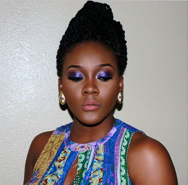 The look features a purple an ombré purple glittery eye, nude lips and a contoured and bronzed face! Talk about Beat!